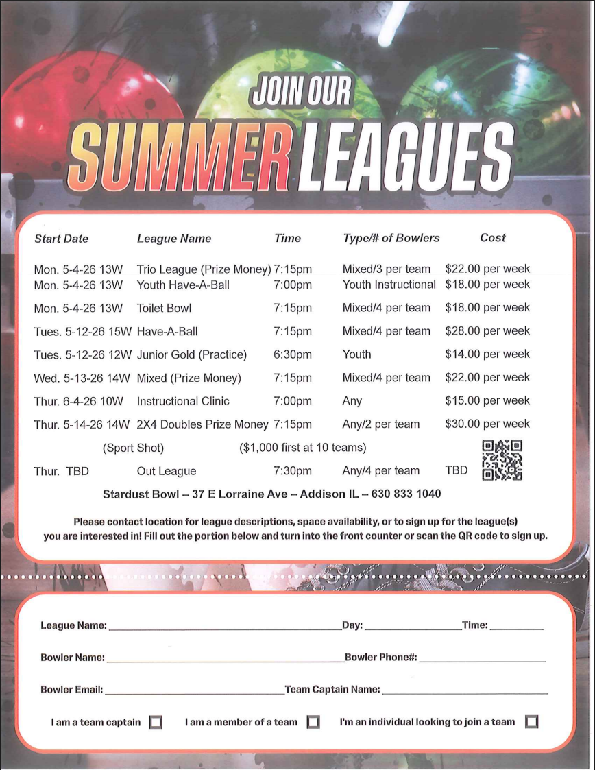 With our 50+ years of serving Chicago area leagues, Stardust Bowl has not forgotten that healthy leagues are what keeps our doors opening every day. Being the largest center in the Chicago area, allows us to continue serving our league bowlers as well as the other functions that have squeezed leagues out of other centers. In today’s economy, league bowling is an inexpensive way to escape your daily routine, make life-long friends and get some exercise while having fun.Call us at 630-833-1040 or fill out the information request below, and we will help find the right league for you.